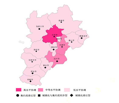 天津市和沧州市属于中度协调。天津市作为直辖市,和北京的情况基本类似,快速城镇化进程中有大量的资金和资源注入、单位面积的投资和产出都很大程度增加,但这种快速城镇化是伴随着建设用地向外扩张,低效利用而发生的,因此城镇化和建设用地中度协调,属于集约度滞后型。沧州市属于城镇化滞后型,到2014年沧州市的城镇化率为46.21%,比2103年增加1.03个百分点,在全省11个地市中增加幅度最小,城镇化率排名为全省第七位,城镇化水平偏低,城市的建设用地完全能够满足沧州市城镇化发展的需要,城镇化与建设用地集约开始出现良性耦合。