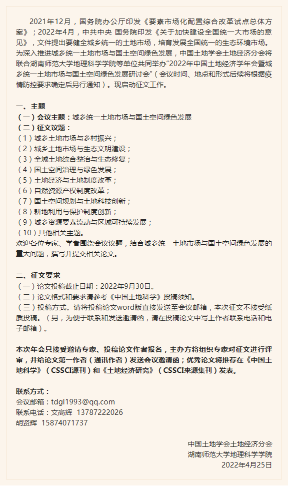 通知|2022年中国土地经济学年会暨“城乡统一土地市场与国土空间绿色发展”研讨会征文通知