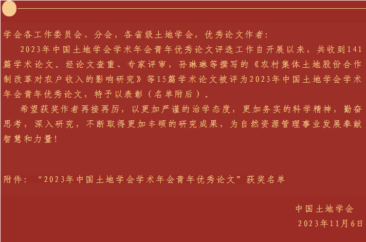 通知|关于表彰2023年中国土地学会学术年会青年优秀论文的通知