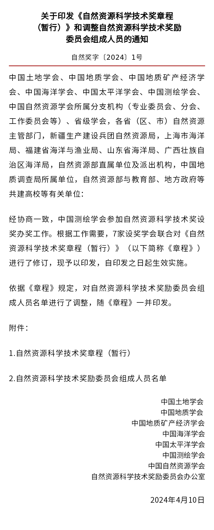 通知|关于印发《自然资源科学技术奖章程(暂行)》和调整自然资源科学技术奖励委员会组成人员的通知