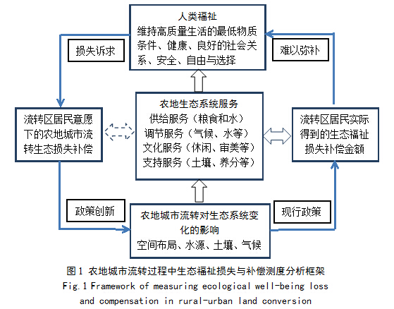 Å©µØ³ÇÊÐÁ÷ת¹ý³ÌÖÐÉú̬¸£ìíËðʧÓë²¹³¥²â¶È·ÖÎö¿ò¼ÜÈçͼ1Ëùʾ¡£´Ó×ÝÏòÉÏ¿´£¬Å©µØ³ÇÊÐÁ÷ת¹ý³ÌÖÐÉú̬¸£ìíËðʧ²¹³¥Êǽ¨Á¢ÔÚÅ©µØÉú̬ϵͳËù¾ßÓеĹ©¸ø·þÎñ¡¢µ÷½Ú·þÎñ¡¢ÎÄ»¯·þÎñºÍÖ§³Ö·þÎñµÈ¹¦ÄܵĻù´¡Ö®ÉϽ¨Á¢ÆðÀ´µÄ¡£¶øÅ©µØÉú̬ϵͳ·þÎñÄÜÁ¦Ö±½ÓÓ°Ïìµ½ÈËÀรìíµÄÎå´ó¹¹³ÉÒªËØ£º°²È«¡¢»ñȡά³Ö¸ßÖÊÁ¿Éú»îµÄ×îµÍÎïÖÊÌõ¼þ¡¢½¡¿µ¡¢Á¼ºÃµÄÉç»á¹ØÏµºÍ×ÔÓÉÓëÑ¡Ôñ¡£È繩¸ø·þÎñµÄ±ä»¯Ó°ÏìʳÎïºÍÆäËûÎïÖÊ×ÊÁϵũӦ£¬Òý·¢Á¸Ê³°²È«ÎÊÌ⣻µ÷½Ú·þÎñµÄ±ä»¯¿ÉÒÔÓ°ÏìºéË®¡¢¸ÉºµµÈ×ÔÈ»ÔÖº¦·¢ÉúµÄƵÂÊÓë¹æÄ££»Î¬³Ö¸ßÖÊÁ¿Éú»îµÄ×îµÍÎïÖÊÌõ¼þÓëÅ©µØÉú̬µÄ¹©¸ø·þÎñ£¨ÈçÁ¸Ê³£©ºÍµ÷½Ú·þÎñ£¨Èç¾»»¯Ë®Ô´£©Ò²¾ßÓÐÃÜÇеĹØÏµ£»¾ÓÃñ½¡¿µÓëÅ©µØÉú̬ϵͳµÄ¹©¸ø·þÎñ£¨Èçα¥×´Ì¬£©ºÍµ÷½Ú·þÎñ£¨Èç¼²²¡´«²¥¡¢ÓÅÖÊÒûÓÃË®µÈ£©Ïà¹Ø£»´ËÍâͨ¹ýÅ©µØÉú̬ÔÚÐÝÏÐÏûDzºÍ¾«Éñ·½ÃæÌṩµÄÎÄ»¯·þÎñÒ²»á¶Ô¾ÓÃñ½¡¿µ²úÉúÓ°Ï죻Éç»á¹ØÏµÖ÷ÒªÊÇÊÜÎÄ»¯·þÎñ£¨µØ·½¸Ð£©µÄ±ä»¯Ó°Ï죻×ÔÓÉÓëÑ¡ÔñÖ÷ÒªÊǽ¨Á¢ÔÚÈËÀรìíÆäËûÒªËØÖ®Éϵģ¬Êܵ½¹©¸ø·þÎñ¡¢ÎÄ»¯·þÎñºÍµ÷½Ú·þÎñµÄ×ÛºÏÓ°Ï졣Ȼ¶øËæ×ųÇÕò»¯ËٶȵIJ»¶Ï¼Ó¿ì£¬Å©µØÓÈÆäÊdzÇÏç½»´íµØ´øµÄÅ©µØ²»¶ÏÏò³ÇÊÐÁ÷ת£¬Å©µØ±»·ÇÅ©½¨ÉèÓõØÕ¼Óá£ÓÉÓÚÅ©µØ³ÇÊÐÁ÷תÊÇÒ»¸öµ¥Ïò²»¿ÉÄæ¹ý³Ì£¬¶ÔÁ÷×ªÇøÓòµÄÉú̬ϵͳµÄÍÁµØÀûÓ÷½Ê½¡¢Ö²±»¸²±»¡¢¿Õ¼ä²¼¾Ö¡¢Ë®Ô´¡¢ÍÁÈÀµÈ²úÉúһϵÁÐÓ°Ï죬´Ó¶øÓ°ÏìÅ©µØÉú̬ϵͳ·þÎñµÄ¹©¸øÄÜÁ¦£¬Ê¹Á÷×ªÇø¾ÓÃñÉú´æ»·¾³ºÍÅ©¸ûÎÄ»¯Ôâµ½¾Þ´óµÄÆÆ»µ£¬×îÖÕ¶ÔÈËÀàÉú̬¸£ìí×´¿ö²úÉúÓ°Ïì¡£´ÓºáÏòÉÏ¿´£¬ÏÖÐÐÕ÷µØ²¹³¥ÖƶÈÖÆ¶¨µÄ²¹³¥±ê×¼£¨Ò²¾ÍÊÇÁ÷×ªÇøÓò¾ÓÃñʵ¼ÊµÃµ½µÄ²¹³¥¶î¶È£©²¢Ã»ÓÐÉæ¼°Å©µØ³ÇÊÐÁ÷ת´øÀ´µÄÉú̬¸£ìíËðʧ£¬ÄÑÒÔÃÖ²¹Á÷×ªÇø¾ÓÃñµÄ¾Þ´óËðʧºÍÉ˺¦£¬²¢ÇÒÔڴ˹ý³ÌÖÐÁ÷×ªÇø¾ÓÃñµÄÕæÊµËðʧ²¹³¥ÒâÔ¸ºÍËßÇóÍùÍù±»ºöÂÔ¡£