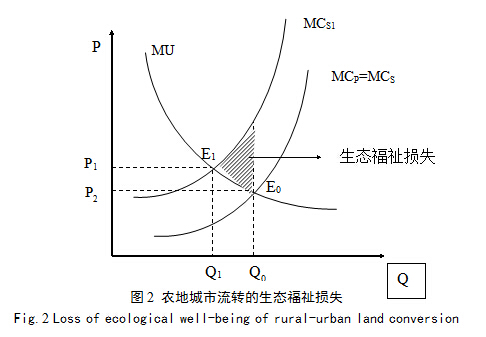 Å©µØ³ÇÊÐÁ÷ת¹ý³ÌÖаéËæ×ÅһϵÁиºµÄÉú̬ÍⲿЧӦ£¬¿ÕÆøÎÛȾ¡¢ÍÁÈÀÇÖÊ´¡¢ÔëÒô¡¢Ë®Ô´ÎÛȾµÈÍⲿЧӦ»á¶ÔÉç»áÕûÌ帣ìí²úÉú¸ºÃæÓ°Ï졣Ȼ¶øÔÚµ±Ç°ÍÁµØÕ÷ÊÕ¡¢Õ÷ÓÃÖÆ¶Èµ±ÖУ¬²¢Ã»Óп¼ÂÇÅ©µØ³ÇÊÐÁ÷תÔì³ÉµÄÉú̬¸£ìíËðʧ£¬ÔÚ¹²Ïí¾¼Ã·¢Õ¹´øÀ´µÄÔöÖµÊÕÒæÖУ¬ºöÂÔÁËÅ©µØÉú̬¼ÛÖµ£¬¶ÔÀûÒæÏà¹ØÖ÷Ì岢ûÓÐÏàÓ¦µÄÉú̬²¹³¥£¬Ê§µØÅ©Ãñ¡¢Á÷×ªÇøÓòÖܱßÅ©Ãñ¡¢³ÇÏç½áºÏ²¿µÄ½¼ÇøÊÐÃñÄËÖÁÕû¸öÉç»á¶¼Òª³Ðµ£ÒòÅ©µØ³ÇÊÐÁ÷ת´øÀ´µÄÉú̬¸£ìíËðʧ£¬´Ó¶øÒýÆð˽È˳ɱ¾ÓëÉç»á³É±¾µÄ²»Ò»Ö£¬Éç»á³É±¾¸ßÓÚ˽È˳ɱ¾¡£Í¼2ÖкáÖá´ú±íÅ©µØ³ÇÊÐÁ÷תµÄÊýÁ¿£¨Q£©£¬×ÝÖá´ú±íÅ©µØ³ÇÊÐÁ÷תµÄ¼Û¸ñ£¨P£©£¬MU±íʾũµØ³ÇÊÐÁ÷תµÄ±ß¼ÊÊÕÒæÇúÏߣ¬MC±íʾũµØ³ÇÊÐÁ÷ת¹ý³ÌÖеı߼ʳɱ¾ÇúÏß¡£ÔÚ×ÊÔ´¾ùºâÅäÖõÄ״̬Ï£¬±ß¼Ê˽È˳ɱ¾ÇúÏßÓë±ß¼ÊÉç»á³É±¾ÇúÏßÖØºÏ£¬¼´MCP=MCS£¬±ß¼ÊÊÕÒæÇúÏßMUÓë±ß¼Ê³É±¾ÇúÏßÔÚµãE0´¦´ïµ½¾ùºâ״̬¡£ÓÉÓÚÅ©µØ³ÇÊÐÁ÷ת¸ºµÄÍⲿЧӦµÄ´æÔÚʹµÃÉç»á³É±¾¸ßÓÚ˽È˳ɱ¾£¬±ß¼ÊÉç»á³É±¾ÇúÏßÉÏÒÆÖÁMCS1ÇúÏߣ¬´ËʱÔÚµãE1´¦ÊµÏÖ¾ùºâ£¬ÇúÃæAE1E0ÔòΪũµØ³ÇÊÐÁ÷ת²úÉúµÄÉú̬¸£ìíËðʧ£¬ËüÒÔ¸ºÍⲿÐÔµÄÐÎʽ´æÔÚ¡£