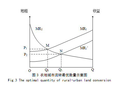 Èçͼ3Ëùʾ£¬OQÎªÇøÓòÍÁµØ×ÜÁ¿£¬MR1±íʾũҵ²¿Ãŵı߼ÊÊÕÒæÇúÏߣ¬MR2Ϊ·Çũҵ²¿Ãŵı߼ÊÊÕÒæÇúÏߣ¬¶þÕß¾ù×ñѱ߼ʱ¨³êµÝ¼õ¹æÂÉ¡£ÔÚÍêÈ«ÐÅÏ¢Êг¡Ìõ¼þÏ£¬ÍÁµØ×ÊÔ´ÅäÖõľùºâµãÔÚMR1=MR2µÄMµã£¬½»Ò×¼Û¸ñΪP1£¬´Ëʱ×îÓÅÇøÓò½¨ÉèÓõØÊýÁ¿ÎªOQ0£¬×îÓŵÄÅ©ÓõØÊýÁ¿ÎªQ0Q¡£È»¶øÔÚÅ©µØ³ÇÊÐÁ÷ת¹ý³ÌÖУ¬ÓÉÓÚ¶ÔÅ©µØÉú̬ϵͳ·þÎñ¼ÛÖµµÄºöÊÓ£¬Õþ¸®Í¨¹ýÍÁµØÕ÷ÊÕ·½Ê½¶ÔÅ©µØ»ñÈ¡µÄ¼Û¸ñÖв¢Î´¿¼ÂÇÅ©µØÉú̬ϵͳµÄ·þÎñ¼ÛÖµ£¬µ¼ÖÂÅ©µØµÄ±ß¼ÊÊÕÒæÇúÏßÓÉMR1ÏÂÒÆÖÁMR1¡¯£¬´ËʱµÄÍÁµØ×ÊÔ´ÅäÖõľùºâµãΪMR2=MR1¡¯µÄNµã£¬½»Ò×¼Û¸ñΪP2£¬½¨ÉèÓõØÊýÁ¿±äΪOQ1£¬Å©ÓõØÊýÁ¿¼õÉÙΪQ1Q¡£ÔÚÕâÒ»¹ý³ÌÖУ¬Õþ¸®»ñµÃÁ˦¤P = P1£P2µÄʧµØÅ©ÃñDZÔÚÊÕÒæ£¬ÆäÖÐÓÐQ0 Q1µÄÅ©µØ·¢ÉúÁ˹ý¶ÈÁ÷ת£¬²»ÀûÓÚ½¨ÉèÓõصĽÚÔ¼¼¯Ô¼ÀûÓá£