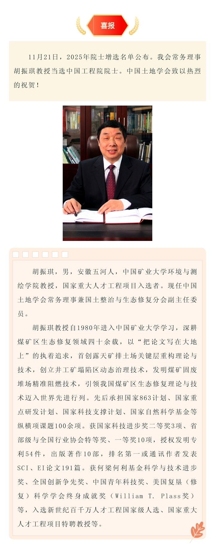 热烈祝贺!中国土地学会常务理事胡振琪教授当选院士!